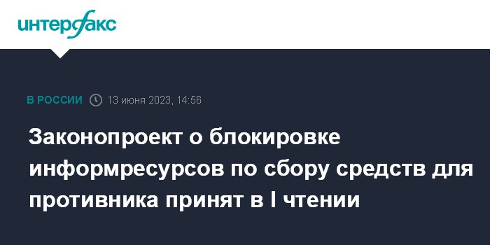 Москва. 13 июня. INTERFAX.RU - Госдума во вторник приняла в первом чтении законопроект о блокировке информационных ресурсов по сбору средств на финансирование противника в условиях военного конфликта.