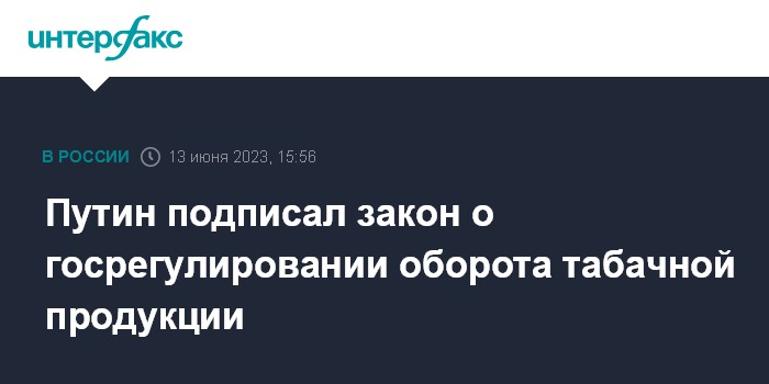 Москва. 13 июня. INTERFAX.RU - Президент РФ Владимир Путин подписал закон "О государственном регулировании производства и оборота табачных изделий, табачной продукции, никотинсодержащей продукции и сырья для их производства".