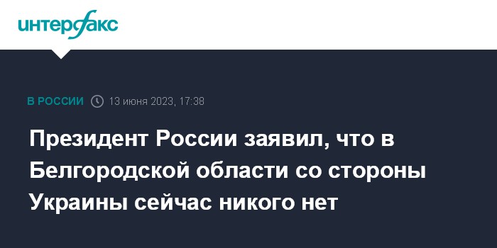 Москва. 13 июня. INTERFAX.RU - В настоящее время в Белгородской области со стороны Украины никого нет, там работают российские пограничники и Вооруженные силы РФ, заявил президент РФ Владимир Путин.