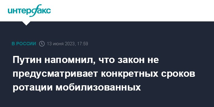 Москва. 13 июня. INTERFAX.RU - Закон не предусматривает конкретных сроков ротации мобилизованных, надо исходить из ситуации развития спецоперации на Украине, заявил президент России Владимир Путин в ходе встречи с военными корреспондентами во вторник.