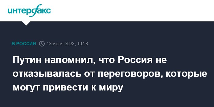 Москва. 13 июня. INTERFAX.RU - Президент РФ Владимир Путин заявил, что Россия никогда не отказывалась от переговоров, которые могут привести к мирному урегулированию конфликта на Украине, отметив, что для этого достаточно прекращения западных поставок вооружения Киеву.