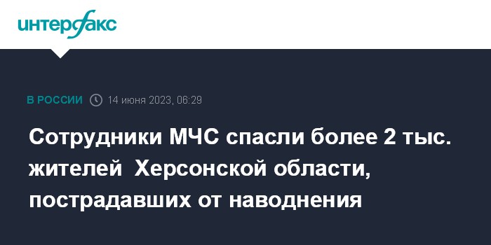 Москва. 14 июня. INTERFAX.RU - Специалисты МЧС России спасли более 2,2 тысяч жителей Херсонской области, пострадавших от наводнения в результате разрушения Каховской ГЭС, сообщило министерство в среду.