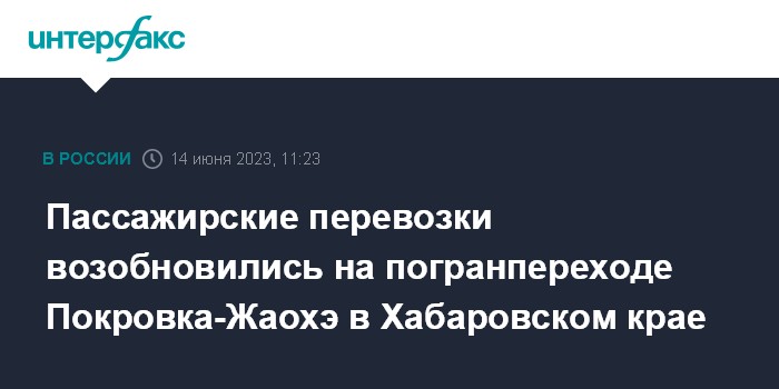 Москва. 14 июня. INTERFAX.RU - После трехлетнего перерыва и снятия антиковидных ограничений возобновлена работа пассажирского сообщения на пункте пропуска через государственную границу Покровка-Жаохэ (КНР), сообщает Минтранс Хабаровского края в среду.