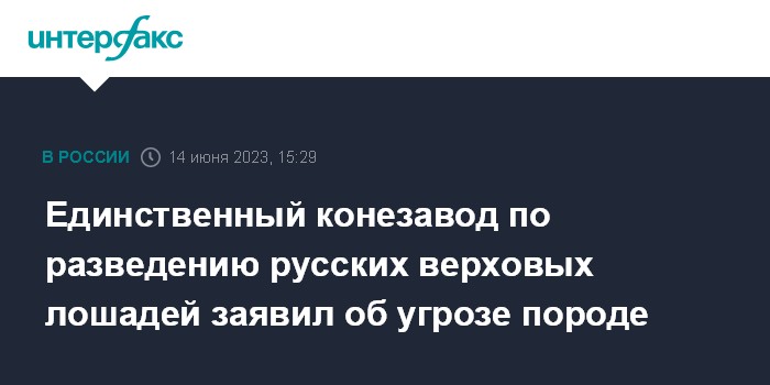 Москва. 14 июня. INTERFAX.RU - Старожиловский конный завод, расположенный в Рязанской области заявил об угрозе исчезновения не имеющей аналогов в мире породы лошадей - русская верховая.