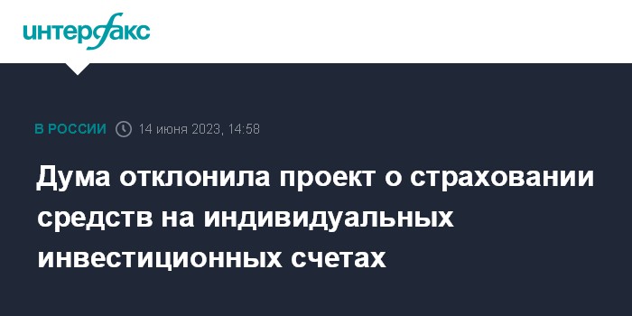 Москва. 14 июня. INTERFAX.RU - Госдума в среду отклонила принятый ранее в первом чтении законопроект, который вводит страхование средств граждан на индивидуальных инвестиционных счетах (ИИС).