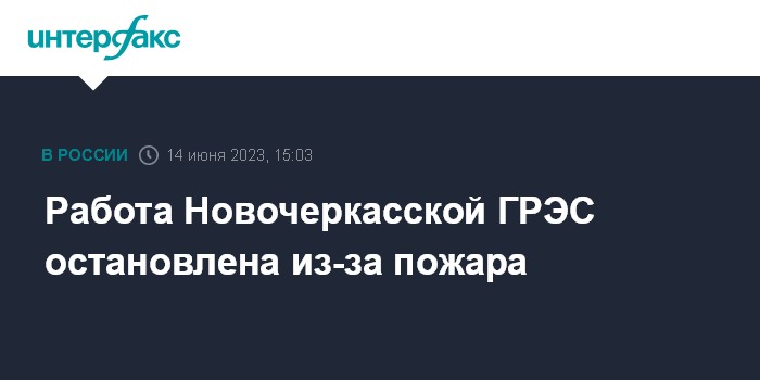 Москва. 14 июня. INTERFAX.RU - В связи с пожаром остановлена работа Новочеркасской ГРЭС, проведена эвакуация персонала, сообщили "Интерфаксу" в пресс-службе ГРЭС.