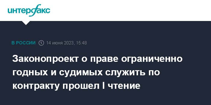 Москва. 14 июня. INTERFAX.RU - Госдума на заседании в среду приняла в первом чтении проект закона, предусматривающий возможность поступать на службу в армию по контракту гражданам, имеющим судимость, а также признанным ограниченно годными к военной службе.