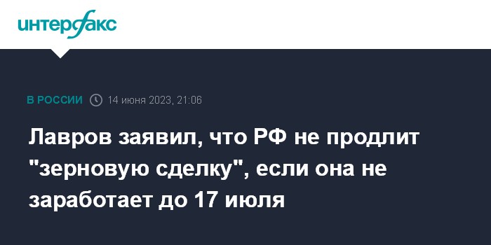 Москва. 14 июня. INTERFAX.RU - Если "зерновая сделка" не заработает до середины июля, продлеваться она не будет, заявил глава МИД России Сергей Лавров.