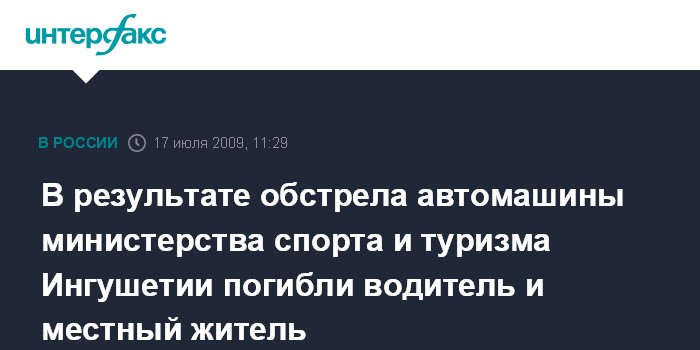 Москва. 16 июля. INTERFAX.RU - Следственное управление СКП РФ по Ингушетии сообщает о гибели двух человек в результате обстрела служебной автомашины министерства спорта и туризма в Малгобекском районе Ингушетии.