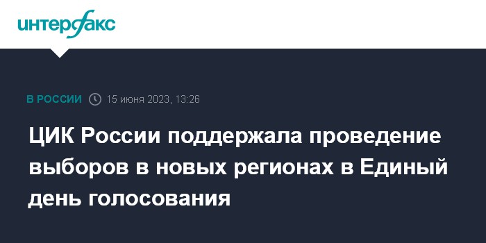Москва. 15 июня. INTERFAX.RU - Центральная избирательная комиссия РФ приняла решение поддержать обращение глав Донецкой и Луганской народных республик, а также Херсонской и Запорожской областей, предложивших провести выборы в новых субъектах РФ в Единый день голосования, 10 сентября.