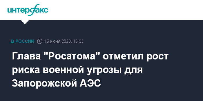 Москва. 15 июня. INTERFAX.RU - Существует угроза прямого удара по Запорожской АЭС, заявил журналистам в кулуарах ПМЭФ гендиректор госкорпорации "Росатом" Алексей Лихачев.