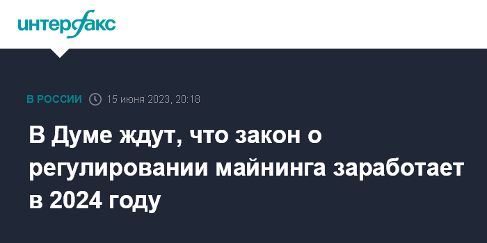 "Я думаю, мы справимся в течении полутора месяцев с тем, чтобы подготовить законопроект (о майнинге криптовалют - ИФ) к рассмотрению в первом чтении. Потом пойдет все быстрее, вполне возможно, что в октябре второе и третье чтение. Соответственно, следующий год уже криптомайнеры и криптовалютчики смогут работать в правовом пространстве и платить налоги, приносить пользу нашей экономике", - сказал Аксаков.