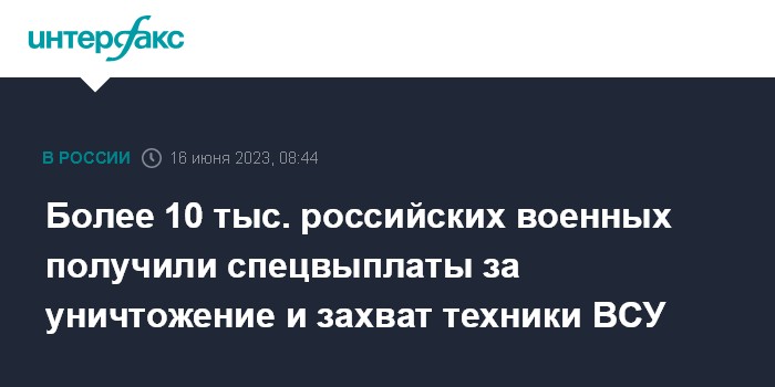 Москва. 16 июня. INTERFAX.RU - В Министерстве обороны России сообщили, что специальные выплаты за уничтожение или захват военной техники вооруженных сил Украины с начала специальной военной операции (СВО) получили более 10 тысяч военных РФ.