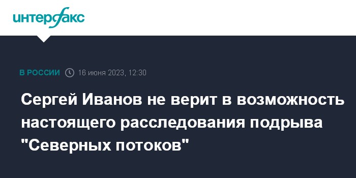 Москва. 16 июня. INTERFAX.RU - Настоящего расследования взрывов на газопроводах "Северный поток" никогда не будет, это означало бы признание в терроризме, заявил телеканалу "Россия-24" специальный представитель президента по вопросам природоохранной деятельности Сергей Иванов.
