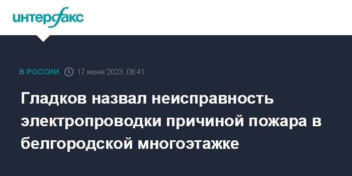 Москва. 17 июня. INTERFAX.RU - Губернатор Белгородской области Вячеслав Гладков назвал неисправность электропроводки причиной произошедшего минувшей ночью пожара в многоэтажном жилом доме на Свято-Троицком бульваре в областном центре.