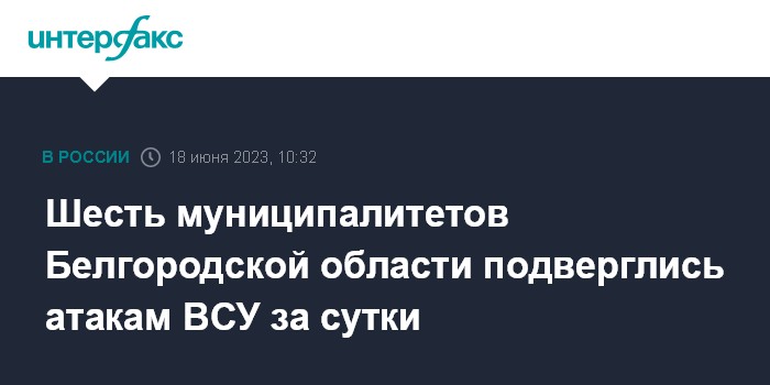 Москва. 18 июня. INTERFAX.RU - Губернатор Белгородской области Вячеслав Гладков сообщил об ударах с украинской стороны, нанесенных по территории шести муниципалитетов региона за истекшие сутки, пострадавших нет.