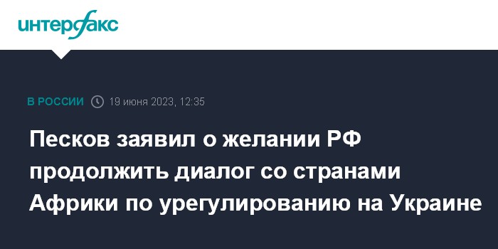 Москва. 19 июня. INTERFAX.RU - Диалог с представителями африканских стран по их мирной инициативе по урегулированию на Украине будет продолжен, заявил пресс-секретарь президента РФ Дмитрий Песков.