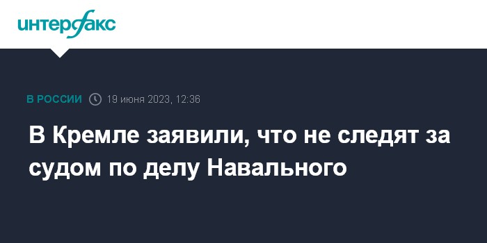 Москва. 19 июня. INTERFAX.RU - В Кремле не следят за судебным процессом по шестому уголовному делу в отношении осужденного Алексея Навального, заявил пресс-секретарь президента РФ Дмитрий Песков.