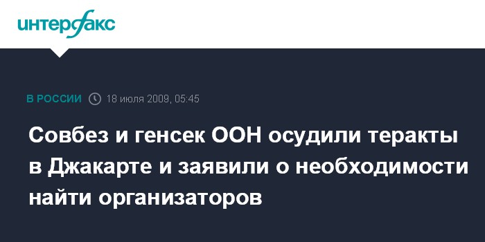 Нью-Йорк. 18 июля. ИНТЕРФАКС - Генеральный секретарь ООН Пан Ги Мун и Совет Безопасности ООН решительно осудили взрывы в двух гостиницах столицы Индонезии Джакарте, которые привели к гибели, по крайней мере, девяти человек, передает центр новостей ООН.