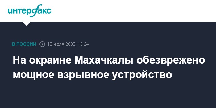 Москва. 18 июля. INTERFAX.RU - Самодельное взрывное устройство большой мощности обнаружено в субботу в дачном обществе "Урожай" на окраине Махачкалы, сообщили "Интерфаксу" в группе общественных связей (ГОС) УФСБ России по Дагестану.
