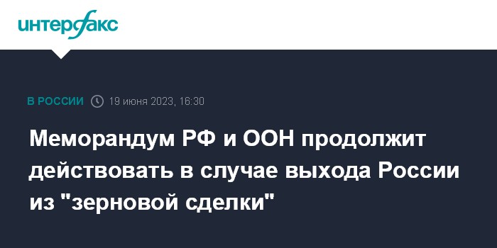 Москва. 19 июня. INTERFAX.RU - Меморандум РФ и ООН по облегчению экспорта сельхозпродукции с Украины не прекратит своего существования в случае досрочного выхода России из "зерновой сделки", заявил в понедельник замглавы МИД РФ Александр Грушко.