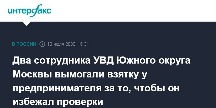 Два сотрудника УВД Южного округа Москвы вымогали взятку у предпринимателя за то, чтобы он избежал проверки