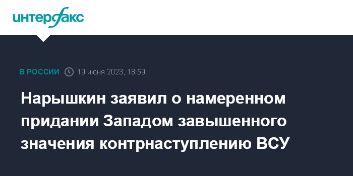 Москва. 19 июня. INTERFAX.RU - Глава СВР Сергей Нарышкин заявил, что Запад намеренно придавал завышенное значение украинскому контрнаступлению, а заявленные Киевом в его рамках цели оцениваются как недостижимые.