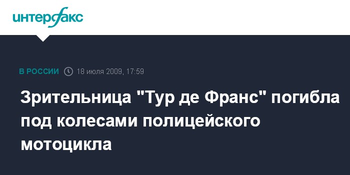 Москва. 18 июля. INTERFAX.RU - На северо-востоке Франции в субботу во время проведения 14-го этапа "Тур де Франс" произошло ДТП, в результате которого погибла зрительница, еще два человека пострадали, сообщает в субботу британская телерадиокорпорация Би-Би-Си.