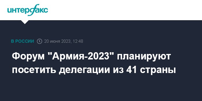 Москва. 20 июня. INTERFAX.RU - Участие в Международном военно-техническом форуме "Армия-2023", который пройдет с 14 по 20 августа, на сегодня подтвердили представители 41 страны, сообщил министр обороны РФ Сергей Шойгу во вторник на заседании коллегии российского военного ведомства.