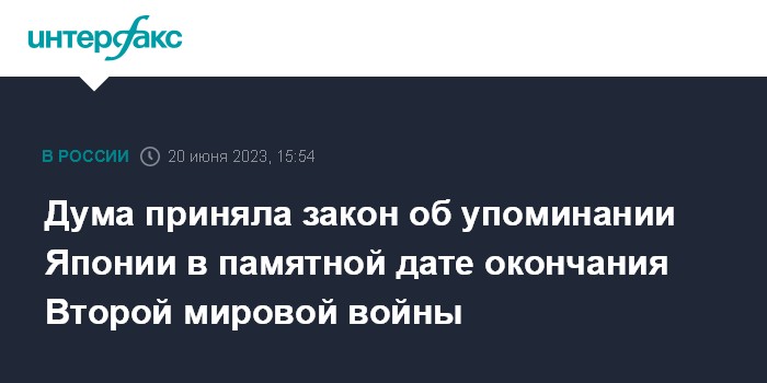Москва. 20 июня. INTERFAX.RU - Госдума во вторник приняла в третьем, окончательном чтении закон, согласно которому памятная дата 3 сентября будет именоваться как "День Победы над милитаристской Японией и окончания Второй мировой войны (1945 год)".