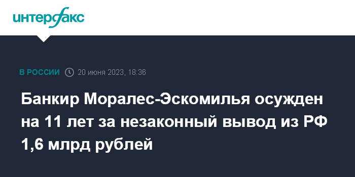 Москва. 20 июня. INTERFAX.RU - Савеловский суд Москвы назначил 11 лет колонии строгого режима банкиру Агустину Моралесу-Эскомилье по делу о незаконном выводе из России более 1,6 млрд рублей, сообщает во вторник Генпрокуратура РФ.