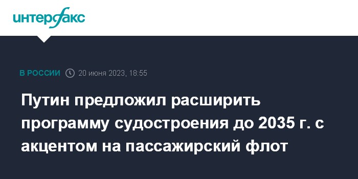 Москва. 20 июня. INTERFAX.RU - Программа гражданского судостроения нуждается в переосмыслении с определением конкретных параметров в части судов для пассажирских перевозок, считает президент РФ Владимир Путин.