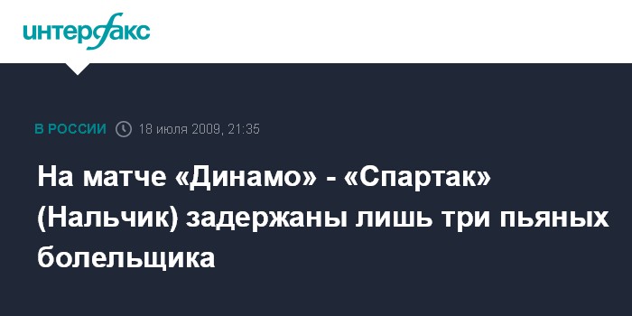 Москва. 18 июля. ИНТЕРФАКС - Во время матча чемпионата России по футболу "Динамо (Москва) - "Спартак (Нальчик), который проходил в субботу в подмосковных Химках, задержаны три человека за нарушения общественного порядка, сообщила "Интерфаксу" референт Управления информации и общественных связей ГУВД Московской области Анастасия Черноиваненко.
