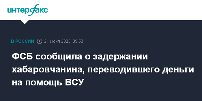 Москва. 21 июня. INTERFAX.RU - Житель Хабаровского края задержан за перевод денег на поддержку украинской армии, возбуждено дело о госизмене, сообщает в среду Центр общественных связей (ЦОС) ФСБ.
