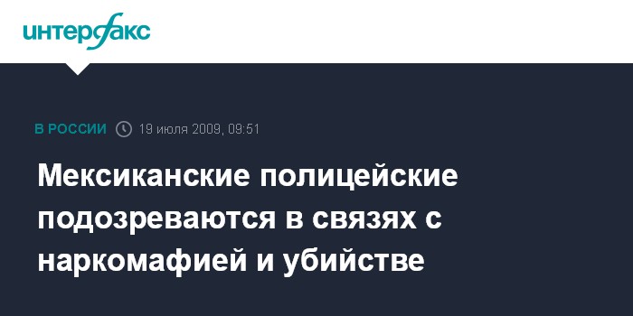 Лондон. 19 июля. INTERFAX.RU - Десять сотрудников мексиканской полиции задержаны по подозрению в причастности к пыткам и убийству 12 федеральных агентов в ходе эскалации нарковойны.