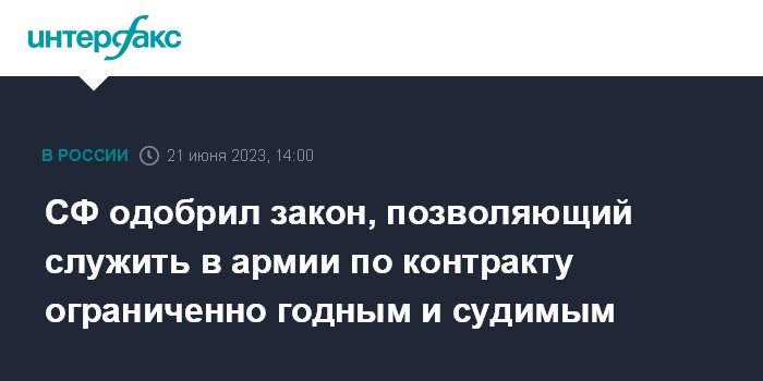 Москва. 21 июня. INTERFAX.RU - Сенаторы РФ проголосовали в среду за закон, предусматривающий возможность поступать на службу в армию по контракту гражданам, имеющим судимость, а также признанным ограниченно годными к военной службе.