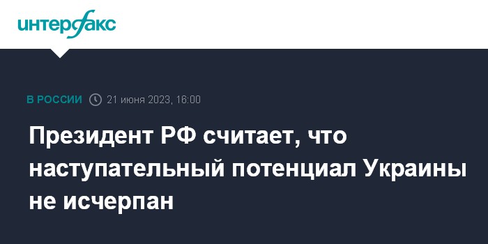 Москва. 21 июня. INTERFAX.RU - Потенциал Украины в ходе контрнаступления пока не исчерпан, хотя шансов у противника нет, считает президент РФ Владимир Путин.