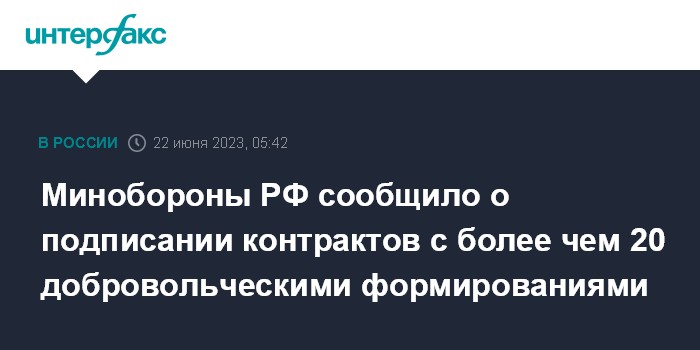 Москва. 22 июня. INTERFAX.RU - Более 20 добровольческих формирований, участвующих в операции на Украине, подписали контракты с российским военным ведомством, сообщили в Минобороны РФ.