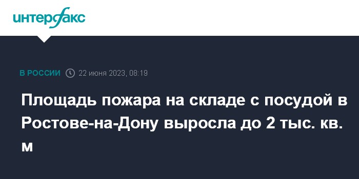 Москва. 22 июня. INTERFAX.RU - Пожарные тушат возгорание на складе с посудой и электронной техникой в Ростове-на-Дону уже на площади в 2 тыс. кв. м, сообщает пресс-служба ГУ МЧС России по Ростовской области