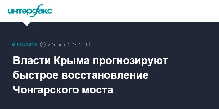Москва. 22 июня. INTERFAX.RU - Чонгарский мост на административной границе Крыма и Херсонской области, поврежденный при обстреле в ночь на четверг, будет восстановлен в кратчайшие сроки, считает председатель крымского Госсовета Владимир Константинов.