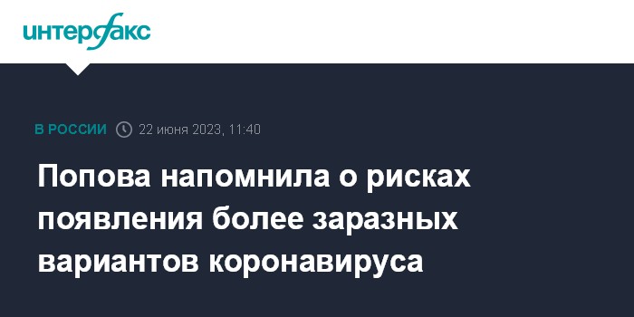 Москва. 22 июня. INTERFAX.RU - Глава Роспотребнадзора Анна Попова заявила, что несмотря на отмену ВОЗ статуса чрезвычайной ситуации по COVID-19, в мире сохраняется угроза возникновения более заразного и вызывающего более тяжелое течение болезни варианта коронавируса.