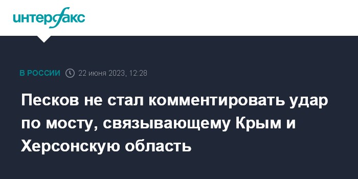 Москва. 22 июня. INTERFAX.RU - Пресс-секретарь президента РФ Дмитрий Песков не стал комментировать удар по Чонгарскому мосту, связывающему Крым и Херсонскую область.