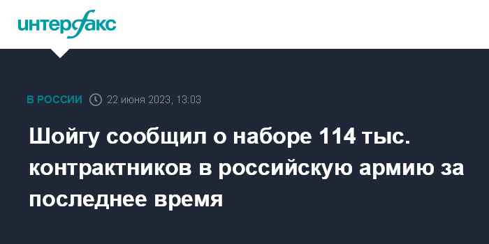 Москва. 22 июня. INTERFAX.RU - Число контрактников в российской армии за последнее время выросло на 114 тыс. человек, заявил министр обороны РФ Сергей Шойгу.