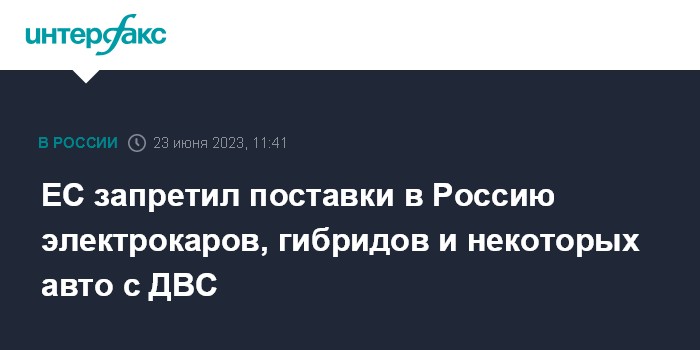Москва. 23 июня. INTERFAX.RU - Евросоюз в рамках 11-го пакета антироссийских санкций запретил поставки в Россию электромобилей и гибридных автомобилей, а также некоторых автомобилей с двигателями внутреннего сгорания, следует из пресс-релиза, опубликованного на сайте Еврокомиссии.