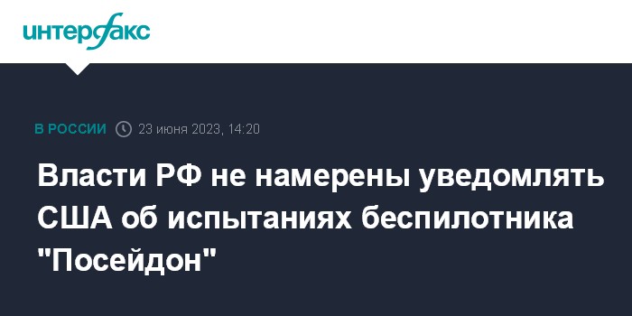 Москва. 23 июня. INTERFAX.RU - Существующие верификационные механизмы между Москвой и Вашингтоном не предусматривают необходимости уведомлять США об испытаниях морского беспилотника "Посейдон", заявил в пятницу замглавы МИД РФ Сергей Рябков.