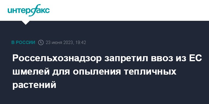 Как сообщает служба, Ассоциация энтомологов и шмелеводов выразила обеспокоенность возможностью ввоза со шмелиными семьями и кормами вирусов и возбудителей различных болезней, которые могут наносить значительный вред выращиваемым в теплицах культурам, а также распространяться среди сельхозработников и потребителей продукции. Для обсуждения этой ситуации и подтверждения безопасности поставляемых в РФ насекомых Россельхознадзор направил в генеральный директорат Еврокомиссии по здравоохранению и безопасности пищевой продукции (DG SANTE) просьбу о проведении видеопереговоров. Однако ответ пока не получен.