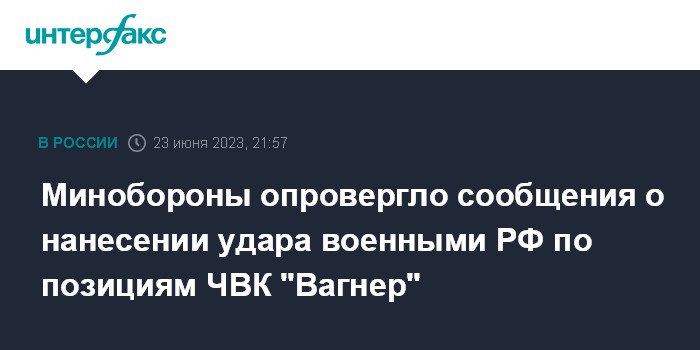 Москва. 23 июня. INTERFAX.RU - Минобороны РФ заявило, что информация о нанесении российскими военными удара по позициям группы "Вагнер" не соответствует действительности.