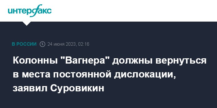 Колонны "Вагнера" должны вернуться в места постоянной дислокации, заявил Суровикин