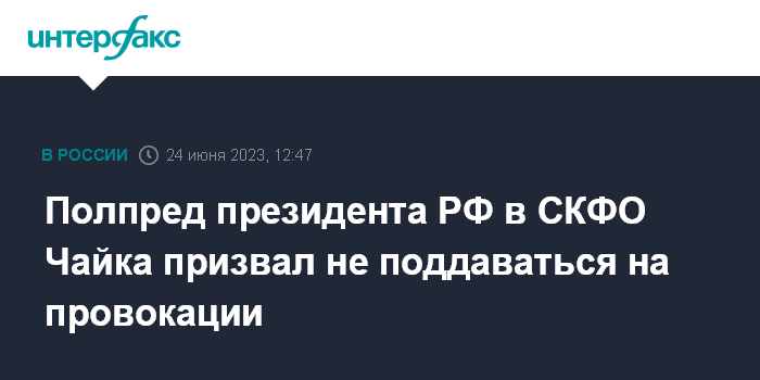 "Обстановка в Северо-Кавказском федеральном округе спокойная и стабильная. Самое важное сейчас не поддаваться на провокации, доверять только проверенным источникам информации, сохранять единство, сплоченность вокруг президента РФ, Верховного главнокомандующего Владимира Путина и неукоснительно выполнять его указания", - приводятся слова Чайки в телеграм-канале полпредства в СКФО.