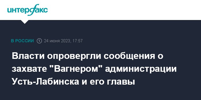 Москва. 24 июня. INTERFAX.RU - Оперативный штаб Краснодарского края назвал недостоверной информацию в анонимных телеграм-каналах и мессенджерах о захвате силами группы "Вагнер" администрации Усть-Лабинска и его главы Станислава Гайнюченко.